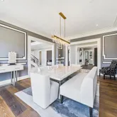 Throughout the home, thoughtful details elevate its beauty and practicality. Custom moldings and detailed ceiling work can be found in every room, adding a layer of elegance. Walnut hardwood floors throughout the home provide a warm and inviting feel, while the back staircase and elevator offer easy access to all levels. The expansive mudroom, complete with a walk-in closet, and the additional back powder room add to the home's convenience and thoughtful design. The four-car garage offers ample space for your vehicles and additional storage.