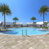 Resort-style pool with palm-lined patio and outdoor kitchen