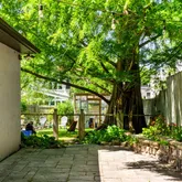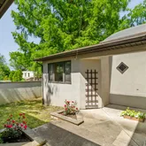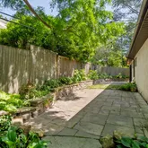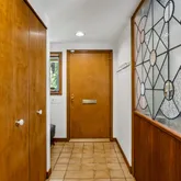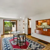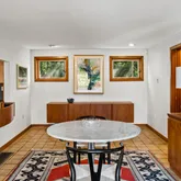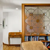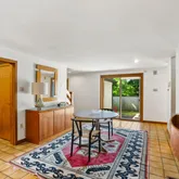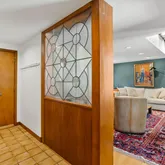 As you enter, you'll be greeted by a Feng Shui-inspired entrance that leads to a bright and inviting living room, featuring a stone fireplace surrounded by built-in shelves and cabinetry. The gracious dining room overlooks a secluded walled garden, with access to an al-fresco dining niche through sliding glass doors. The adjoining custom kitchen is a chef’s delight, boasting bespoke tiles and a built-in table with dining benches, perfect for casual meals and entertaining.