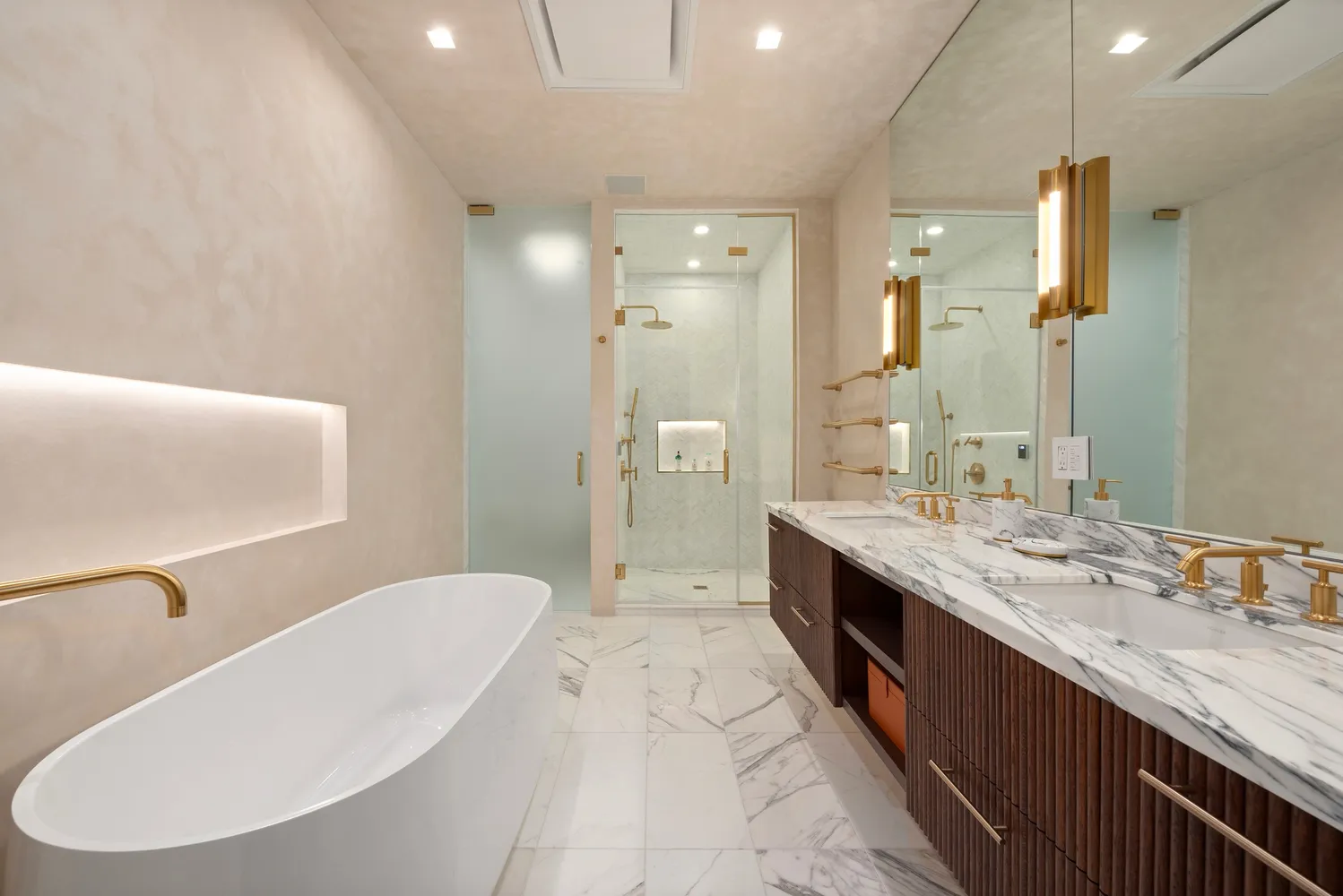 Both bedrooms are situated away from Mercer street and are pin drop quiet. The primary suite is a sanctuary and luxurious, featuring a spectacular custom-outfitted dressing area and a sumptuous five-fixture bath with steam shower and radiant heated floors. Motorized blackout shades in both bedrooms ensure privacy and tranquility. The secondary bedroom, complete with an ensuite bathroom with radiant heated floors, maintains the loft's standard of luxury and comfort.