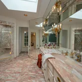 The first-floor primary suite offers a serene retreat with direct backyard access and two ensuite bathrooms, including an updated spa-like bath with a walk-in shower, bench seating, and overhead shower, as well as a second bath with a soaking tub and walk-in shower. Upstairs, six additional bedrooms are complemented by multiple full bathrooms, including several updated baths.