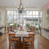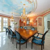 The kitchen is equipped with custom cabinetry, granite countertops, a Dacor gas cooktop, and a double-door custom Sub-Zero refrigerator. The dining room is a true showpiece, featuring a hand-painted mural ceiling, dual chandeliers, and oversized doors that open to the back patio.