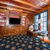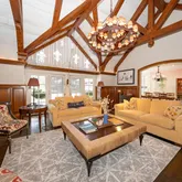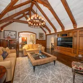 The formal living room is highlighted by a dramatic two-story ceiling and expansive floor-to-ceiling windows. A beautifully appointed office features custom wood built-in bookshelves and a fireplace with a striking black marble surround. A second living room, ideally located near the kitchen, is rich in character with cathedral ceilings accented by wood beams, custom wood paneling, detailed crown molding, a fireplace, and a built-in bar alcove, creating an inviting setting for entertaining.