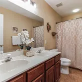 Three additional bedrooms on this floor provide ample space and comfort, each with lush carpeting and generous closet space, sharing a full hall bathroom with a dual vanity and a tub shower.