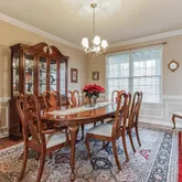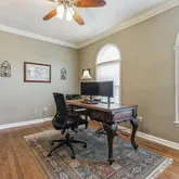 To your left, a private home office awaits behind glass French doors, providing a quiet retreat for work or study. To the right, the formal dining room beckons with refined chair railing, crown molding, and hardwood floors, perfect for hosting elegant dinner parties.