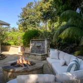 The park-like backyard with mountain views is designed for entertaining, featuring a serene in-ground pool, infrared sauna, two fire pits, barbecue area, Sonos outdoor sound system, and a beautiful redwood dining table.
