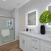 - Room Bathroom Features: Bathtub, Shower in Tub, Double Sinks in Primary Bath, Exhaust fan(s), Privacy toilet door, Quartz Counters, Walk-in shower