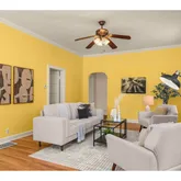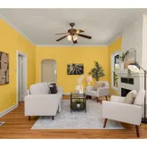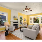 - Living Room Features: Bay Window, Ceiling Fan, Fireplace, Hardwood Floors