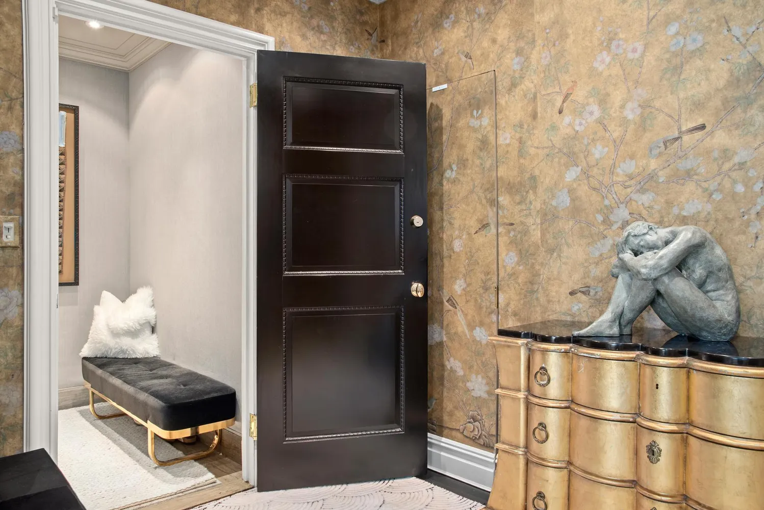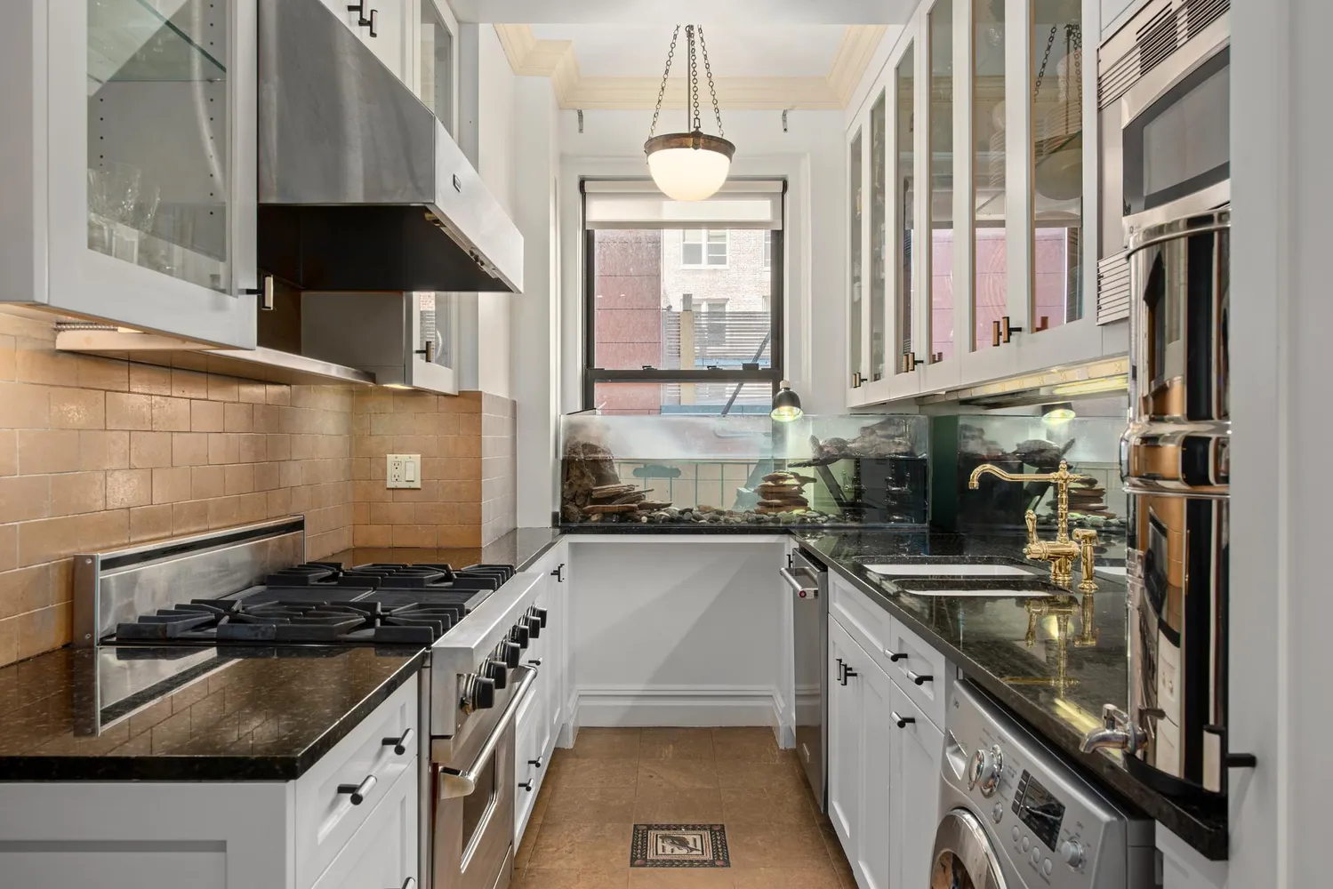 A regal foyer with designer hand-painted wallcoverings and a concealed coat closet creates a dramatic first impression. Ahead, the loft-like living room stretches 22 feet long to a wide expanse of south-facing windows and park views. A decorative fireplace flanked by illuminated niches perfect for artwork adds to the refined ambiance. Ahead, the formal dining room adorned with Art Deco London light fixtures welcomes lavish entertaining with another hidden closet and custom under-window cabinetry. Chefs will adore the updated windowed kitchen where glass-inset cabinetry features stone counters and Waterworks fixtures. The upscale stainless steel appliances include a new Viking range, Sub-Zero refrigerator, KitchenAid dishwasher and built-in microwave.