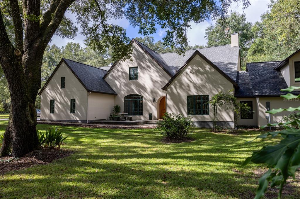 vast lawns and gardens for outdoor recreation and relaxation, a large, shaded patio with outdoor seating, perfect for al fresco dining and gatherings with fireplace, a barn or outbuilding for storage, as well as potential for equestrian or farming activities. The majestic oak trees scattered throughout the property provide both shade and an air of timelessness, making it an idyllic spot for leisurely strolls and picnics. This modern French Farmhouse on 13 acres in North Florida, with its harmonious blend of rustic charm and contemporary amenities, is a captivating haven for those seeking a retreat from the hustle and bustle of city life. It combines the elegance of French-inspired design with the natural beauty of the North Florida landscape, making it a dream home for those who appreciate both luxury and tranquility.