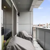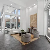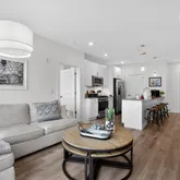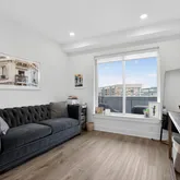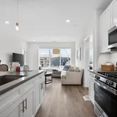 Step into a sun-filled open-concept living and dining area that flows seamlessly into a modern gourmet kitchen featuring quartz countertops, soft-close cabinetry, stainless steel appliances, under-cabinet lighting, and a large island with seating—perfect for both everyday living and entertaining. Just off the living space, a private balcony overlooking Girard Ave offers the perfect spot for morning coffee or evening relaxation.