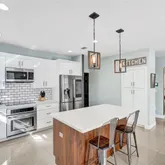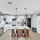 The updated kitchen serves as the heart of the home, featuring quartz countertops, state-of-the-art appliances, generous pantry storage, and clear sightlines to the living areas and backyard. Updated interiors include durable porcelain and marble flooring throughout (no carpet), making everyday living easy and low maintenance.