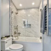 - Mudroom with honed/non-slip stone tile, built-in cubbys, frosted glass solid doors