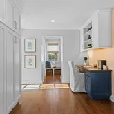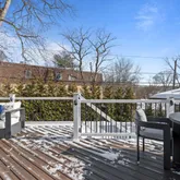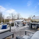 Inside, the first floor is a masterclass in refined living. Gleaming hardwood floors and an abundance of natural light create a warm and inviting ambiance. At the heart of the home is a chef’s kitchen built for both culinary artistry and everyday ease, featuring premium appliances such as a Sub-Zero refrigerator, Thermador gas range, and Miele dishwasher. The eat-in kitchen, complete with a custom banquette, flows seamlessly into the cozy family room, where a gas fireplace framed by built-in shelves and shiplap adds a touch of charm. From here, step through the sliders onto a stunning 400-square-foot TREX deck, outfitted with lighting and a custom automatic awning, creating the perfect setting for al fresco dining or entertaining under the stars. A custom shed for ample storage, compliments the house.