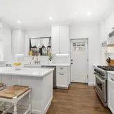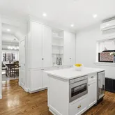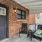 The main duplex residence features 3 bedrooms and 1.5 bathrooms with beautifully refinished original hardwood floors, elegant crown moldings, and a striking marble-faced fireplace that anchors the living space. The custom kitchen is equipped with Viking appliances, custom cabinetry, a center island with built-in microwave, and a wine cooler—perfect for everyday living and entertaining. All bathrooms are finished in marble with Kohler fixtures, providing a refined, spa-like feel. Comfort is enhanced with Mitsubishi mini-split systems throughout, offering efficient heating and cooling year-round.
