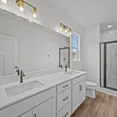 Primary Suite that features a generous walk in closet, double sinks, and large tiled shower with seat. The laundry and powder room