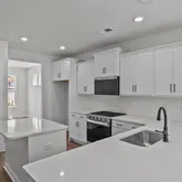 that leads into your beautiful kitchen featuring beautiful white cabinetry, light Quartz countertops, tile backsplash, center island and