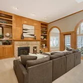 fireplace framed by classic built-in bookshelves—creating a warm, inviting space for everyday living or cozy gatherings. The walkout lower level is designed for entertaining—offering a generous amusement room, billiard area, stone-surround fireplace, and a walk-behind wet bar equipped with a built-in refrigerator and wine storage. Additional highlights include custom hardwood built-ins throughout, a Garage Force–coated garage floor