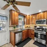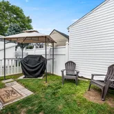 Step inside to find laminate flooring throughout the first floor, abundant natural light, and a large living room that flows into a dining area. The kitchen is both functional and stylish, offering stainless steel appliances, a gas stove, and plenty of cabinet space, with an outside exit to the rear deck and yard—an ideal setup for summer cookouts.