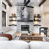 great room with a cozy fireplace, built-in shelving, laundry on main level and access to a spacious covered deck, perfect
