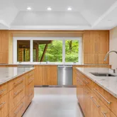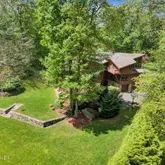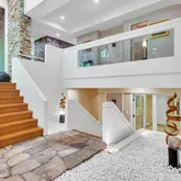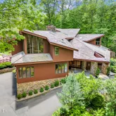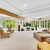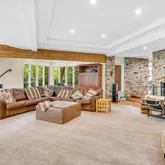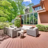 Featuring an open floor plan, the home boasts soaring ceilings, impeccable stonework and oversized windows that flood the space with natural light and offer views of the lush surroundings. The newly renovated gourmet kitchen, complete with custom cabinetry and state-of-the-art appliances, is ideal for the culinary enthusiast. Elegant, spacious entertaining areas seamlessly connect, perfect for hosting gatherings or enjoying everyday living. Additional amenities include an expansive deck and private outdoor spaces, leading to a gorgeous parklike backyard.