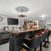 - Exclusions: Items hanging on the walls in the bar area, Chandelier in the game room, Vise attached to work bench, smaller outdoor cabinet next to shed.