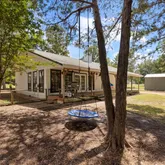 The home fits the life. An open floor plan connects living, dining, and kitchen around a custom wood fireplace. The primary suite opens directly to the back patio so your morning coffee comes with a view of the trees. Nearly an acre includes a fenced paddock, a working chicken coop, garden space, and a large storage shed.