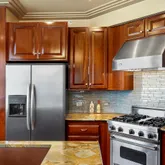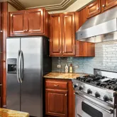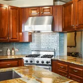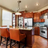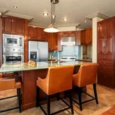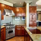 - Room Description: Quartzite counters, custom backsplash, stainless appliances, hand-cut tile flooring, custom cabinetry