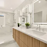 The spacious primary suite serves as a private retreat, featuring a spa-inspired bath with an integrated wet room, deep soaking tub, and floor-to-ceiling porcelain tile.