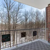 Inside, enjoy an open, easy-flow layout with a spacious living/dining area and a large kitchen/family room—the true heart of the home. The kitchen shines with granite counters and island updates, recessed lighting, and white KitchenAid appliances, while rich hardwood flooring carries through the main living areas and both bedrooms/closets. Cozy up by the fireplace, then step out to the star feature: a totally private balcony overlooking the woods—your own little “ahhhhhh” moment at the end of the day.
