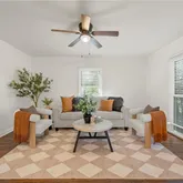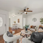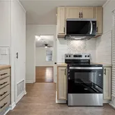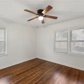 Fresh paint throughout the home creates a clean, inviting feel. Gorgeous hardwood floors in the living area and bedrooms add warmth and character. Updated kitchen featuring new countertops, freshly painted cabinets, stylish backsplash, and a suite of new appliances, including a built-in microwave, oven, and stove. Vinyl plank flooring in the kitchen and bathroom for easy maintenance. Ceiling fans in each bedroom and window blinds throughout for comfort and privacy. Walk-in closet for ample storage plus additional closet space in each bedroom. Spacious walk-in pantry for extra organization. Updated bathroom with a shower/tub combo, new fixtures, and a fresh backsplash design. Exterior & Mechanical: