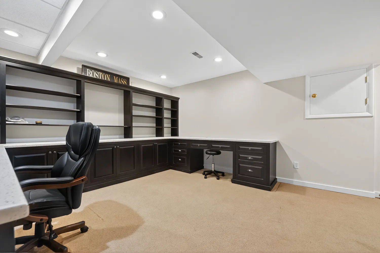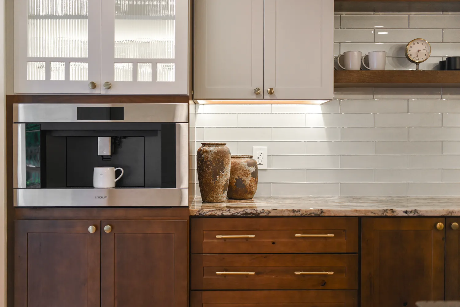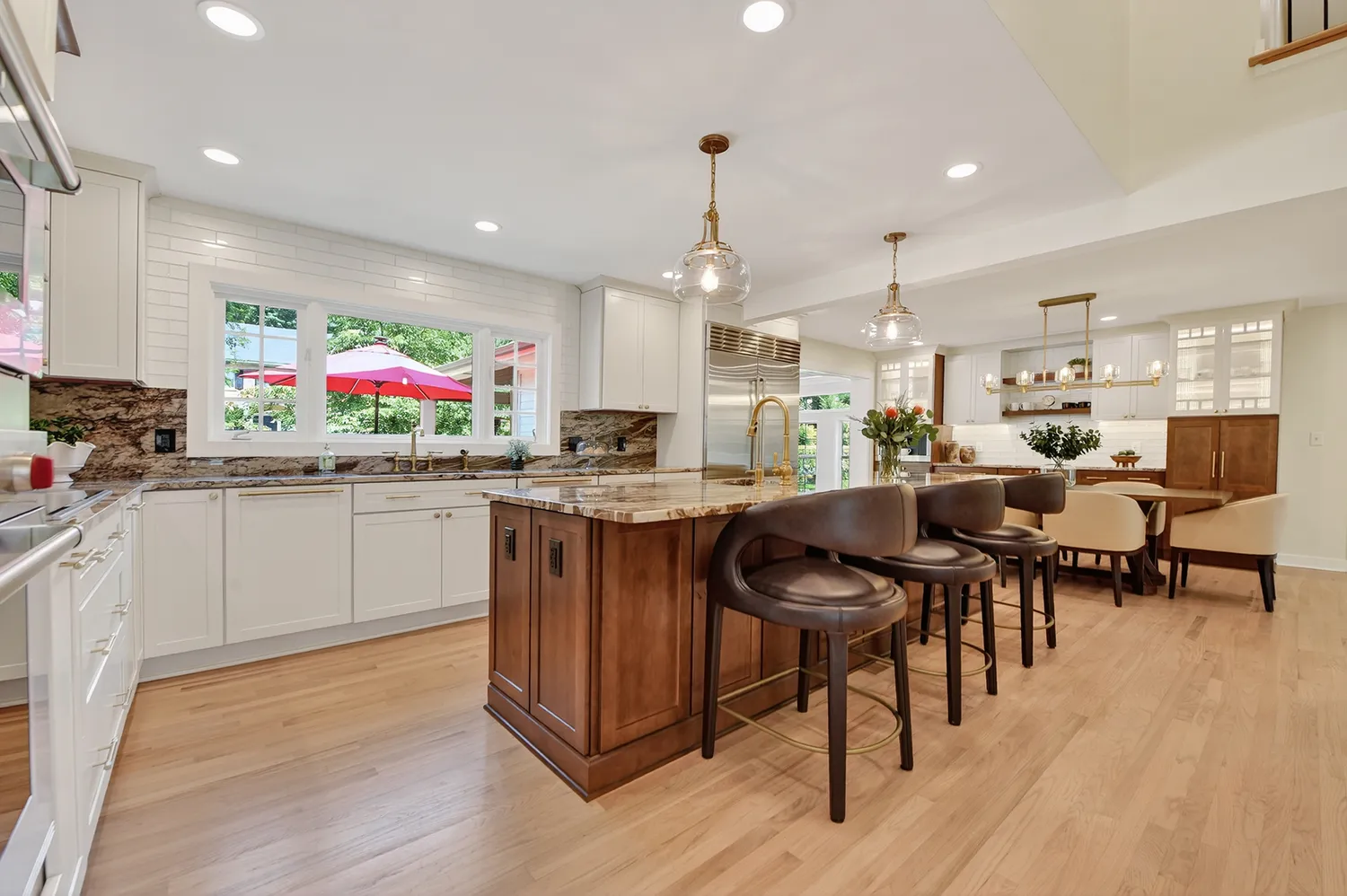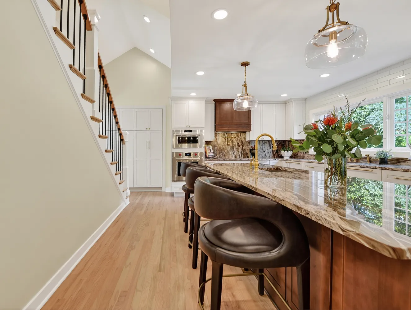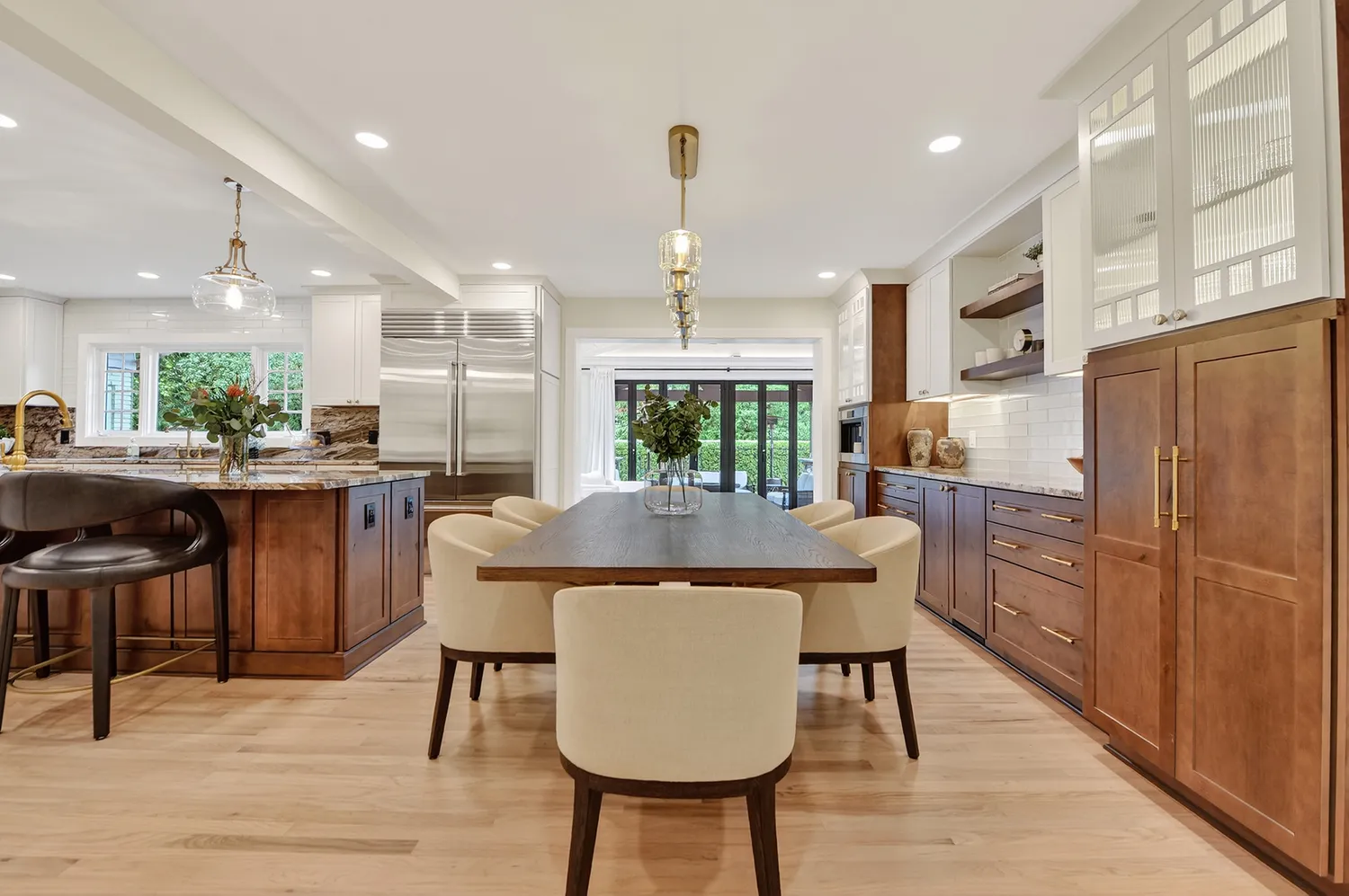 The kitchen, fully renovated in 2024, serves as the heart of the home—a gathering space perfect for family events and entertaining. It boasts mystic quartzite countertops, an expansive island that invites conversation with the chef during meal preparation, and accommodates a 6-8 person table. Premium Wolf appliances, a Miele coffee system, Sub-Zero refrigerator/freezer, and Kohler brass fixtures enhance the culinary experience.