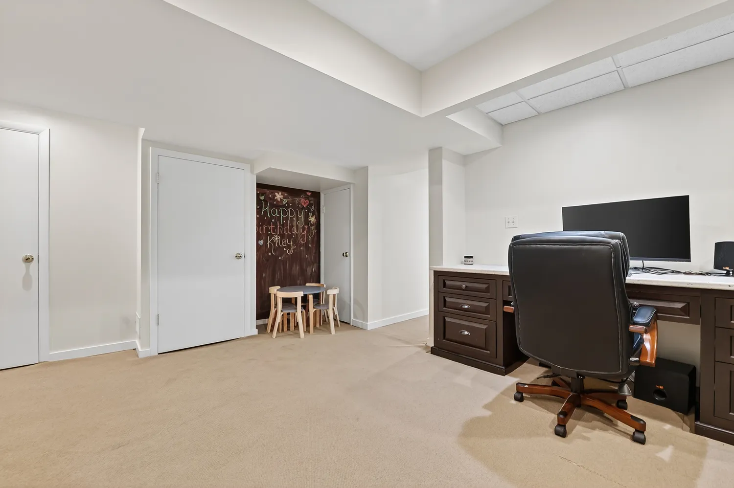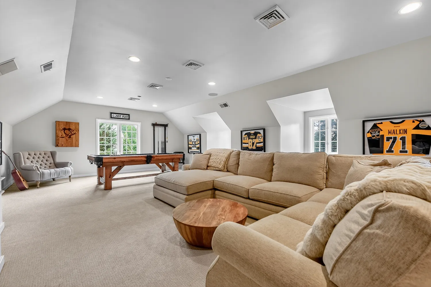 The second floor features two ensuite bedrooms and an oversized game room. The residence also offers a versatile lower-level office or playroom with ample storage space. The laundry room is situated on the lower level, with a hookup for a stackable unit near the primary suite.