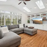 On the main level, the residence boasts abundant natural light and a gracious flow throughout with its well-proportioned living spaces accented by gleaming hardwood floors and recessed lighting. The dining room accommodates a variety of multi-sized furnishings and the expansive kitchen features quartz countertop with stainless-steel appliances and a fireplace ready for entertaining family and friends. A spacious family room with beautiful built-ins, skylights, and floor to ceiling doors welcomes you to the outdoor terrace for your kids and pets to play around. An office/5th bedroom with a full bath can be found on this level too.