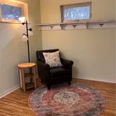 downstairs living room set up for relaxing or working at a corner desk. Beautiful artisan stained concrete floors are through out. There is also a