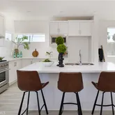The interiors are outfitted with professional-grade kitchens featuring 36" ranges, stainless steel appliances, sleek cabinetry, in-unit washer and dryer hookups, designer-selected finishes, and central air conditioning throughout. Each home also includes a private patio, off-street guest parking, and access through a gated pedestrian entry for added security and peace of mind.
