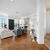 The living room offers an inviting space with beautiful ocean views, while the adjacent patio provides a peaceful setting to enjoy the scenery. A formal dining room connects seamlessly to the chef’s kitchen, which features high-end appliances and generous counter space, ideal for both everyday living and entertaining.