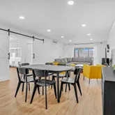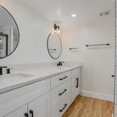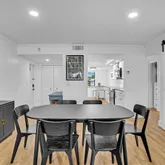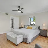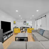 Step inside to wide-plank flooring, smooth ceilings, custom lighting, and a spacious, sunlit layout. The sleek galley-style kitchen is both functional and stylish, featuring granite countertops, a barn-style sink, custom cabinetry, and premium stainless steel appliances. Both bathrooms have been completely redone with quality materials and tasteful finishes. The third bedroom is currently used as a home office and features oversized barn doors, allowing the space to function as a flexible extension of the main living area. When open, these doors invite natural light deep into the home and enhance the open, airy feel of the interior.