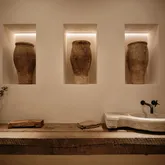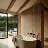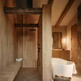 - Bathroom Features: Powder Room, Double Vanity(s), Shower and Tub, Shower Over Tub, Shower Stall, Travertine
