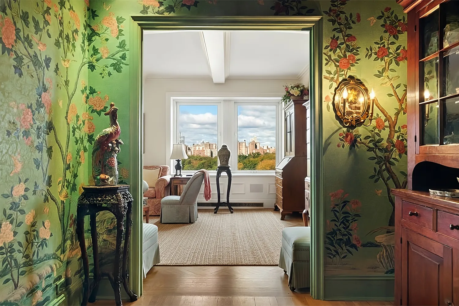 Enter through a formal gallery accessible via a semi-private vestibule, where you're greeted by solid oak floors, custom hand-crafted wallpaper, gold leaf ceilings, and a welcoming wet bar—setting the tone for the opulence that awaits. The gallery seamlessly flows into a sun-drenched corner living room featuring oversized windows with breathtaking west and south-facing views of Central Park. This magnificent space is further enhanced by a working fireplace, providing a warm and inviting ambiance.
