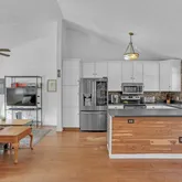- Kitchen Features: Breakfast Bar, Cabinets White, Laminate Counters, View to Family Room