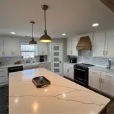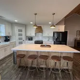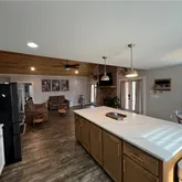 - Kitchen Features: Breakfast Bar, Cabinets White, Kitchen Island, Other Surface Counters, Solid Surface Counters, View to Family Room