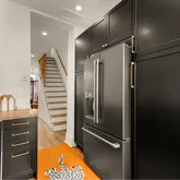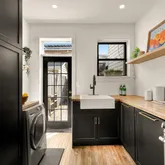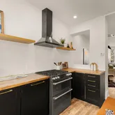 Inside, warm oak hardwood floors and painted brick accents create inviting contrast throughout the updated interior. The semi-open floor plan offers flexible space to relax, work, and dine with an easy, natural flow. The renovated kitchen is designed for both everyday living and entertaining, featuring GE Café black stainless steel appliances, classic butcher block countertops, a gas range, farmhouse sink, and generous cabinet storage. Step outside to your private, fenced rear deck — perfect for morning coffee or evening cocktails.