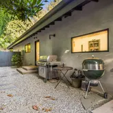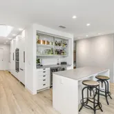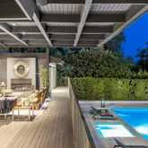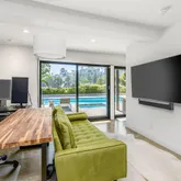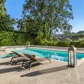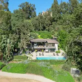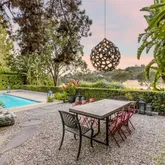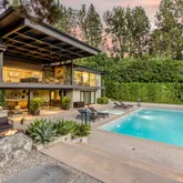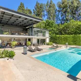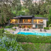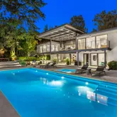The home boasts a private driveway and professionally landscaped grounds. The backyard is perfect for entertaining, with a covered patio, built-in amenities, and oversized pool. The elegant interior is highlighted by an oversized glass pivot door, high ceilings, custom cabinetry, and a wine cellar.