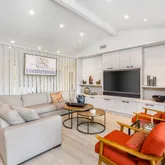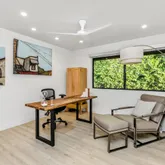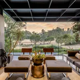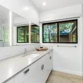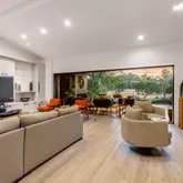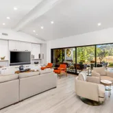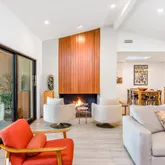 The spacious living room opens to a covered deck offering stunning golf course views, complete with a fireplace for hosting gatherings. While the design captures Mid-Century spirit, it remains contemporary, providing both grand entertaining spaces and intimate nooks for relaxation.