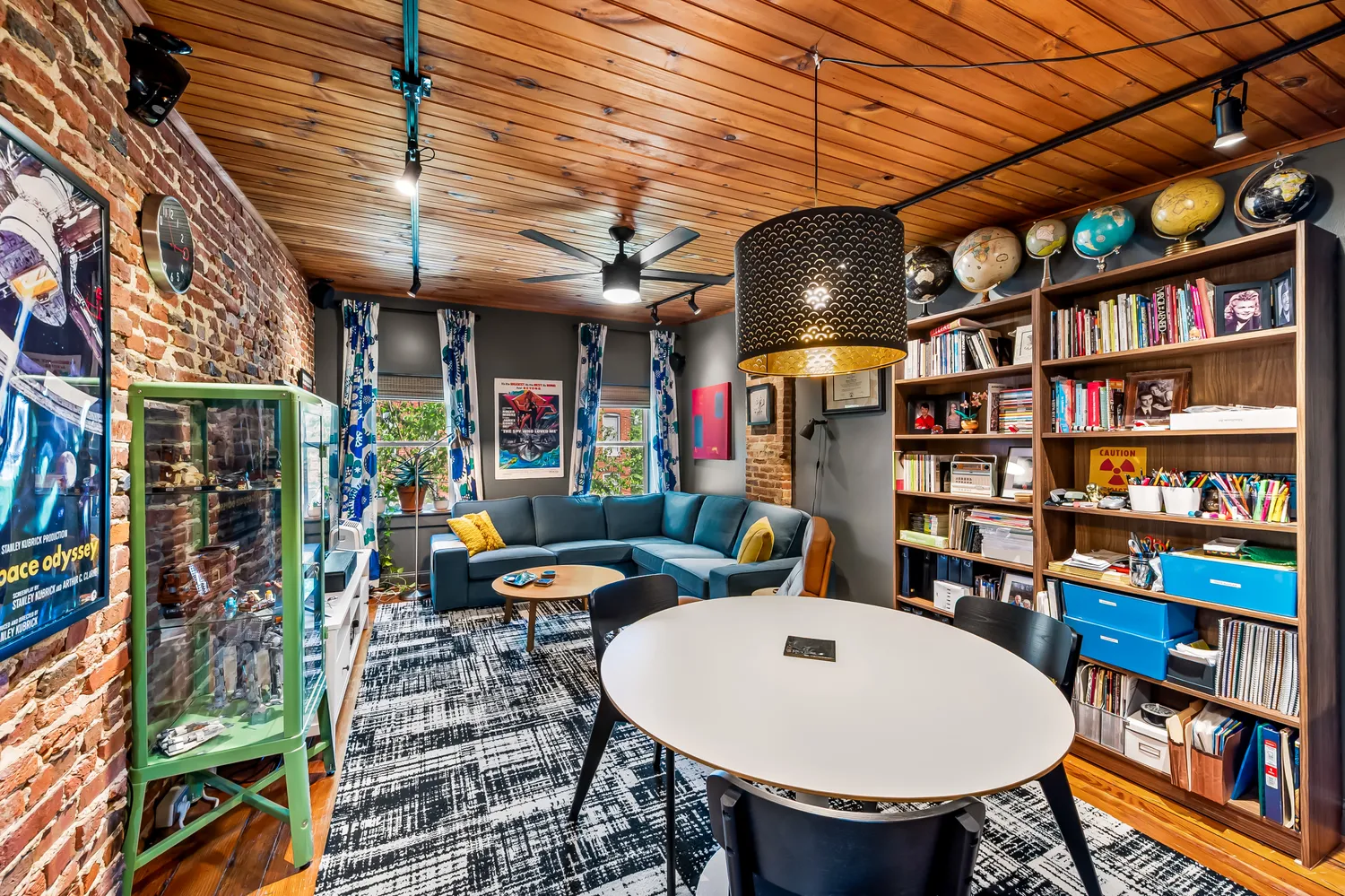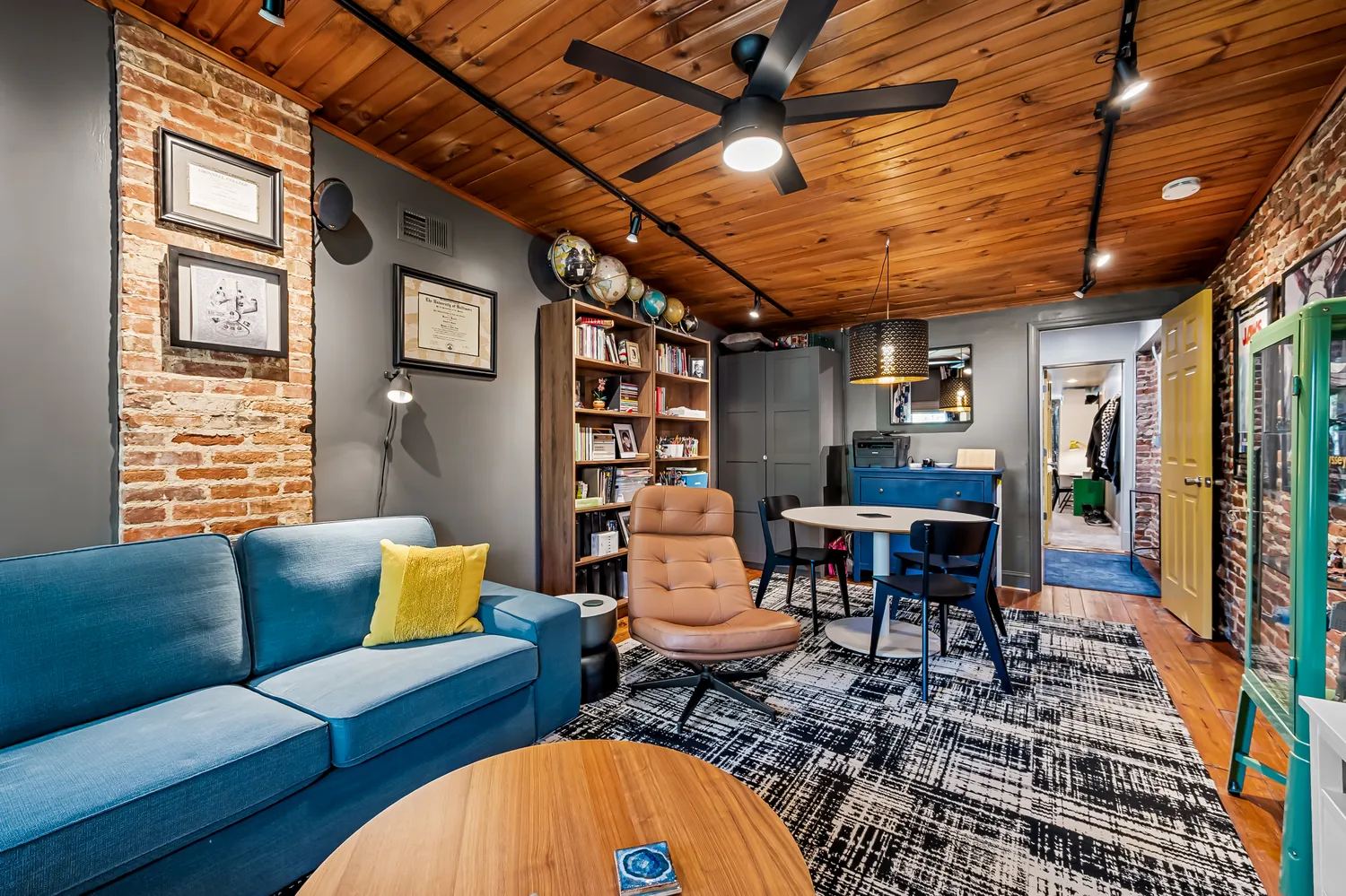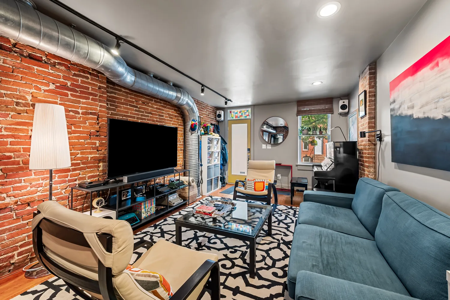 Originally reimagined by New Renaissance Architects and Builders, this 4-bedroom, 2.5-bath home is defined by its exposed brick walls, floating steel staircase, and dramatic industrial ductwork, creating a truly one-of-a-kind interior aesthetic. The main living space is both warm and contemporary, with an effortless flow into the dining and kitchen areas.