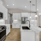 - Interior Features: Kitchen/Family Room Combo, Open Floorplan, Primary Bedroom Main Floor, Solid Surface Counters, Split Bedroom, Thermostat, Vaulted Ceiling(s), Walk-In Closet(s), Window Treatments