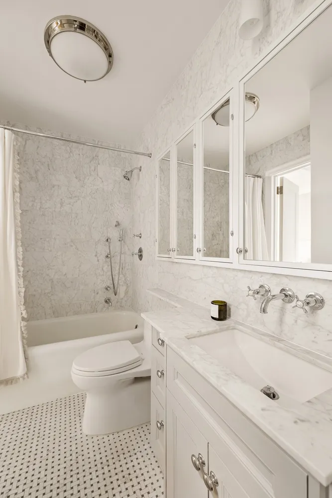 The tranquil bedroom includes a dressing room or home office, a generous walk-in closet, windows facing north and south, and through-the-wall air conditioning. The classic marble bathroom features a basket-weave floor, radiant heat, Waterworks fixtures, and an original cast-iron tub/shower.