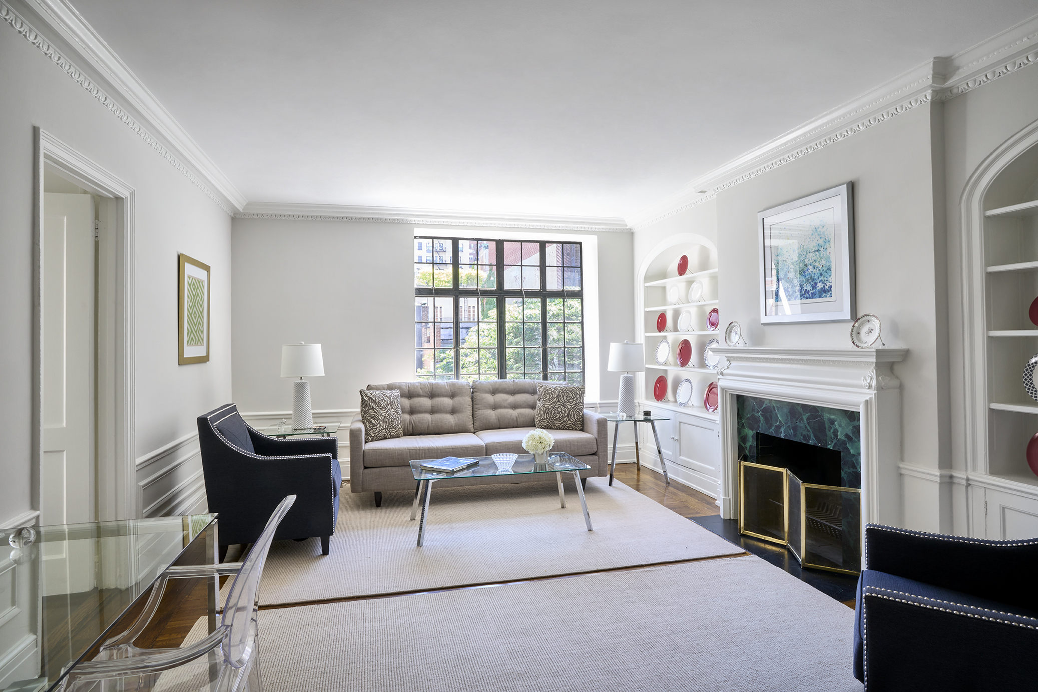 The large Entrance Foyer/Dining Room opens through an arched doorway into a light-filled, spacious Living Room, with crown and base moldings, built-in shelving, and a wood burning fireplace. The hardwood floors, details, and Large, original, steel casement, paned windows give the apartment a classic, New York feel.