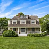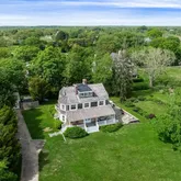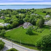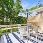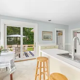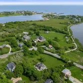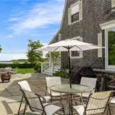 A large south-facing covered porch offers views of Round Pond and the ocean beyond. An east-facing patio overlooks the gardens, perfect for enjoying a morning coffee, while a deck off the the kitchen and an outdoor shower enhance the coastal lifestyle.